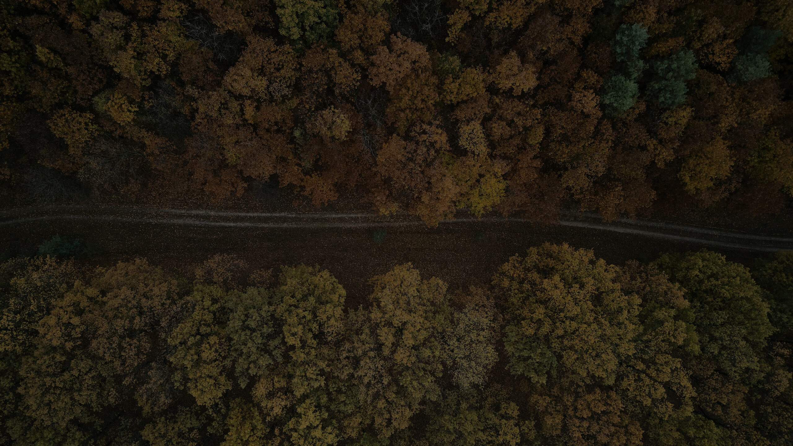 Family Autumn Walk In the Forest Aerial view of road hidden between forest