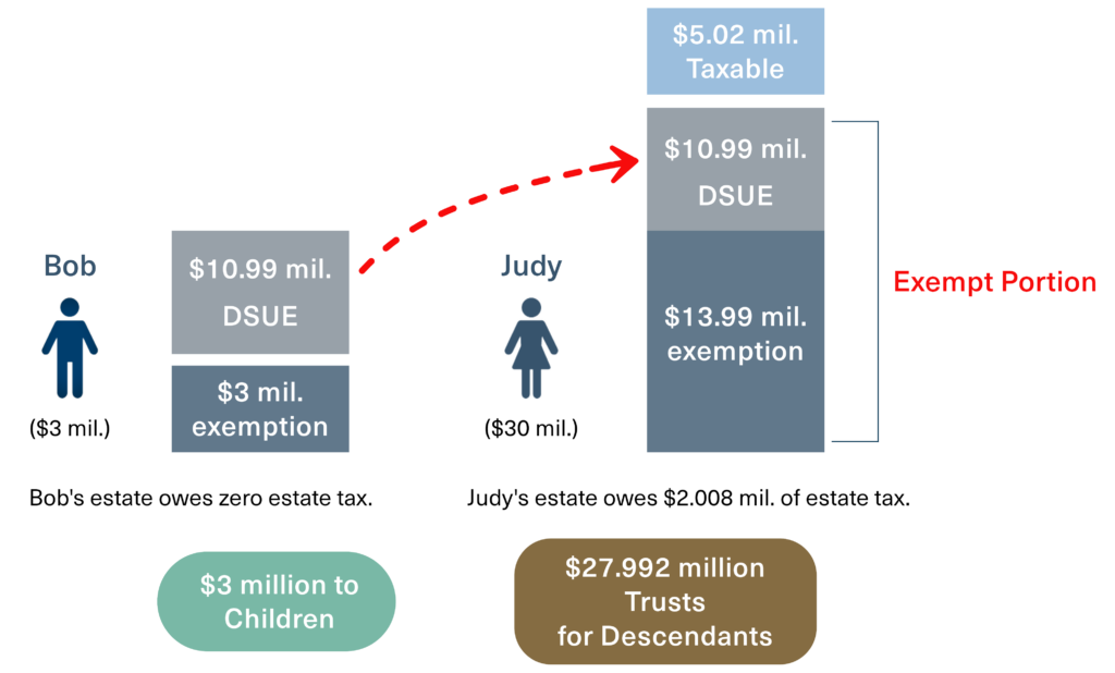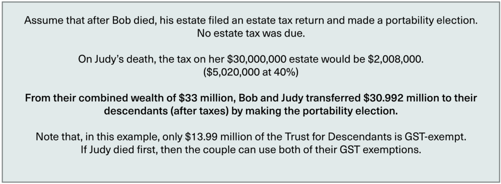 Assume that Bob dies in 2025 and Judy dies a few years later leaving all of her assets to trusts for their descendants. Assume further that the estate tax exemption remains fixed at $13.99 million.