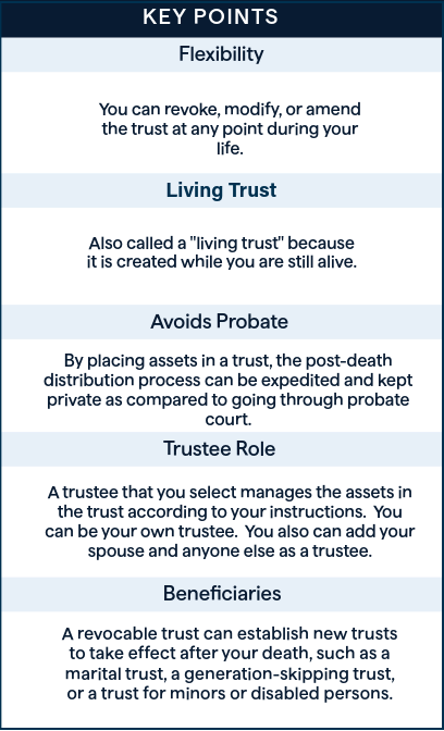 Avoids probate: A revocable trust avoids the legal process of probate, which is required for assets transferred through a will. However, a simple “pour-over” will is still necessary even if you have a revocable trust.