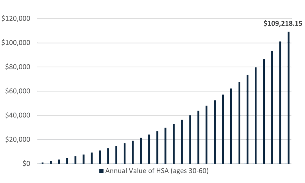 HSAs take healthcare savings a step further – giving you the ability to accumulate and invest savings over time for qualified expenses. (A note that HSAs are only available for high-deductible plans.) For example, if you contribute $1,000 at the start of each year to your HSA and make no withdrawals from ages 30-60, assuming 7% annual returns, you could have $109,218 in your account after 30 years.