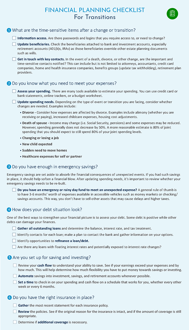 Throughout their lives, women face challenges at every turn in their careers, family situations, health, and more. We are here to work with you and highlight the financial tools and strategies available to address and mitigate these challenges. Our Financial Planning Checklist for Transitions is one example of a tool you can use to prepare for the unexpected.