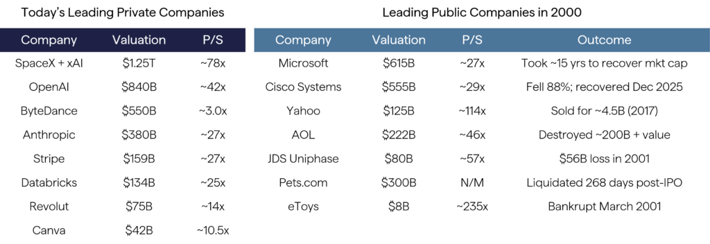 Adding another layer to the valuation discussion is the growing anticipation around AI-focused companies planning to go public. Wall Street enthusiasm regarding potential IPOs, starting with SpaceX, has intensified, with investors eager for exposure to the next generation of technology. This optimism echoes prior cycles where transformative technologies fueled lofty expectations well ahead of proven, durable cash flows. While some of these companies may ultimately justify premium valuations, it is unlikely all will live up to the hype. Below is a chart comparing price/sales (PS) valuations of today’s leading private companies to leading internet companies at the peak of the dot-com bubble. While fundamentals drive growth, valuation also matters.