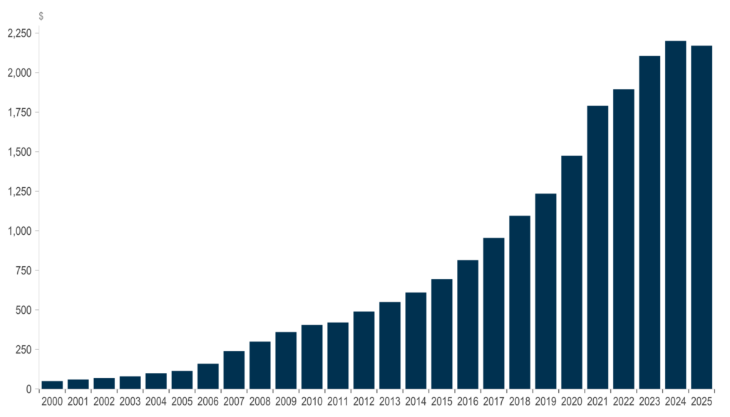Following the Global Financial Crisis, regulatory changes reduced the role of traditional banks in corporate lending. Private equity and private credit firms stepped in to fill this gap, creating a rapidly expanding ecosystem of unregulated non-bank lending, in many instances to lower-quality borrowers. This market has grown to roughly $1.8 trillion today, representing approximately 1 to 2% of the total lending market. Now this market is poised to expand beyond institutional investors into the retail channel as demand from traditional sources of private capital, such as university endowments, has dried up. Recent legislation has been proposed to allow private investments to be held in individual retirement accounts and 401ks.