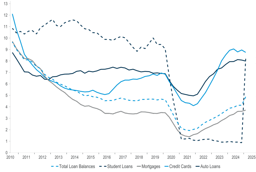 Tariff-related price hikes may also align with the resumption of student loan repayments. Student loan delinquency rates have risen to about 8.5% in 2025, reflecting financial strain on recent graduates and younger consumers. According to the New York Fed’s Center for Microeconomic Data, student loan balances reached $1.63 trillion in 2025, with a significant increase in the rate at which balances shift from current to delinquent, due to the restart of reporting student loans on credit reports after a five-year pause.