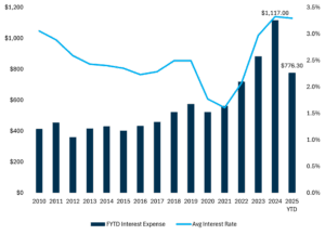 US Federal Interest Payments ($ Billions) vs. Average Interest Rate (%)