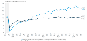 Depending on the extent to which the new administration is able to carry out its plan to deport millions of immigrants, the consequences will be felt throughout the economy. According to recent US census data, non-US citizens make up about 10% of the workforce. As seen in the following employment chart, most of the growth in the labor force since the pandemic is attributed to foreign-born workers. In a tight labor market, as is the case now, reducing the number of available workers for each job contributes to higher wages, which reduces profitability and can be inflationary. Sectors of the economy that may be particularly hard hit are agriculture, construction, and leisure/hospitality, some of which show job openings still exceeding the number of people unemployed.